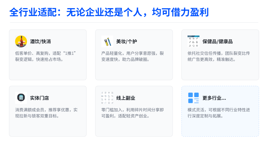 链动1+1不是只适用于酒饮行业,而是具备全行业适配性,只要你有产品、有拓客需求、想搭建团队,都能靠它实现增长。