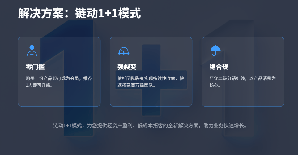 裂变模式最让人担心的就是合规问题,链动1+1从机制设计到落地执行,都全方位规避了风险,让企业和个人都能安心参与: