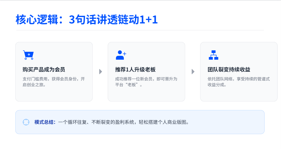 核心逻辑其实就3句大白话:买一份产品就能成会员,推荐1人就能升级老板,靠团队裂变实现持续收益。