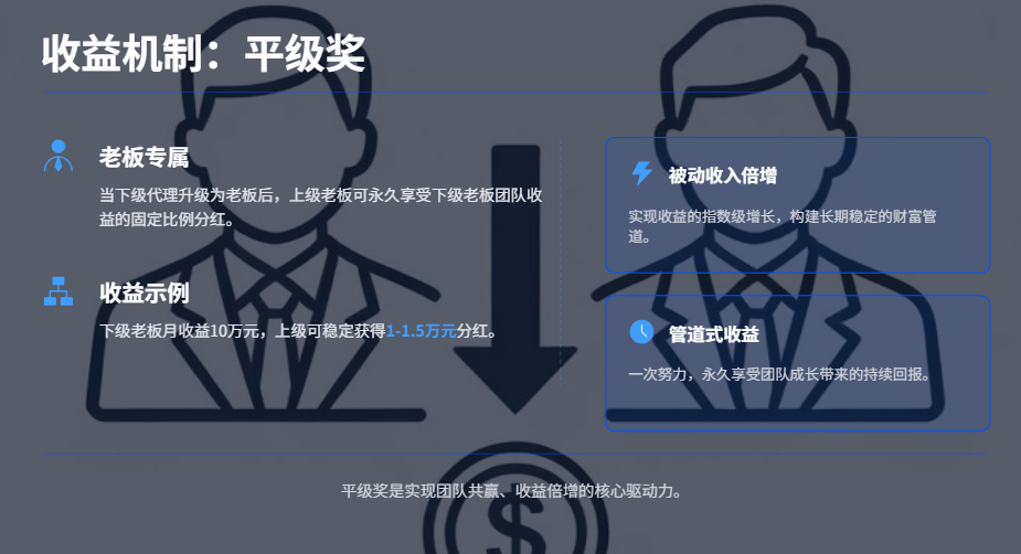 ► 平级奖:如果你的下级代理也升级成了老板,你作为上级老板,能永久享受他团队收益10%-15%的固定分红。