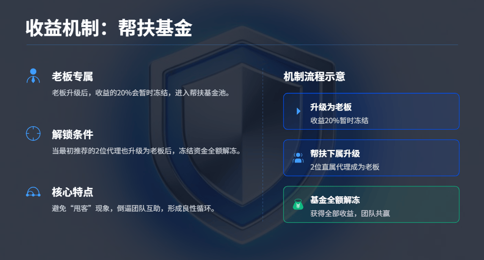 帮扶基金是平台的激励保障机制:老板升级后,收益的20%会暂时冻结,等你最初推荐的2位代理也升级成老板,冻结的资金就会全额解冻。