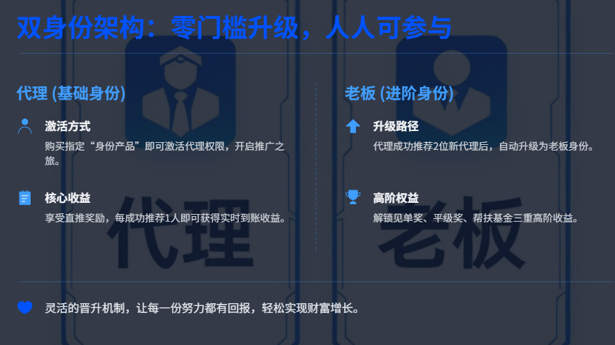 ► 老板(进阶身份):代理成功推荐2位完成身份产品购买的新代理后,不用额外花钱,也不用平台审核,自动就能升级成老板。