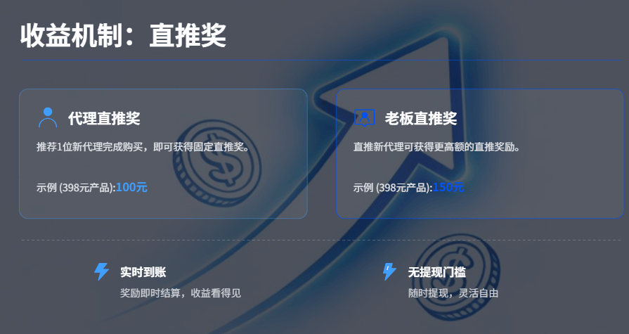 ► 直推奖:代理推荐1位新代理完成购买,就能拿到固定直推奖(比如398元产品对应100元),实时到账、没有提现门槛;
